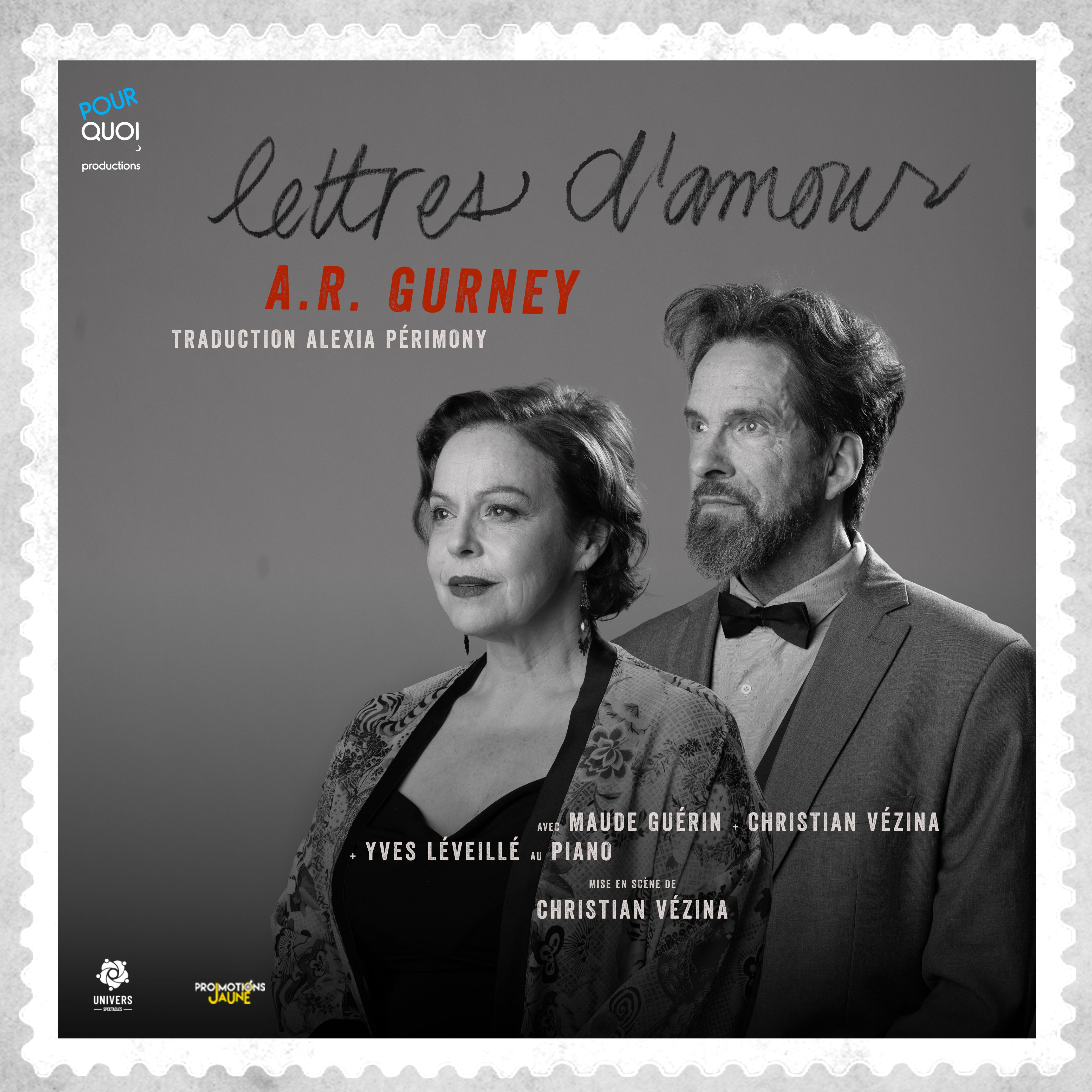 De Broadway au Québec, venez découvrir Lettres d'amour, l'adaptation francophone de Love Letters, cette oeuvre monumentale qui fût jadis finaliste du prix Pulitzer de théâtre. Mélissa (Maude Guérin) et Andrew (Christian Vézina) s'aiment depuis l'enfance ; un amour impossible, souvent drôle, parfois orageux. Ils ne seront jamais en couple, mais resteront toute leur vie en étroite relation, essentiellement par le biais des lettres qu'ils ne cesseront de s'écrire. Les comédiens seront appuyés sur scène par le pianiste Yves Léveillé, qui de sa musique, bercera le récit de cet amour inavoué.